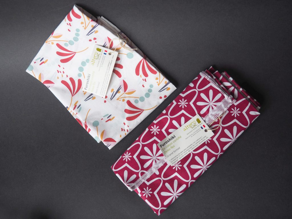 *Le furoshiki est une technique de pliage et nouage issue d’une tradition japonaise plus que millénaire ! On plie un carré de tissu pour en faire un contenant ou emballage. Dans son pays d’origine, il est considéré comme un véritable art, nourri en permanence par de nouveaux motifs et nouages créatifs. Le furoshiki est en quelque sorte « l’origami du tissu ».