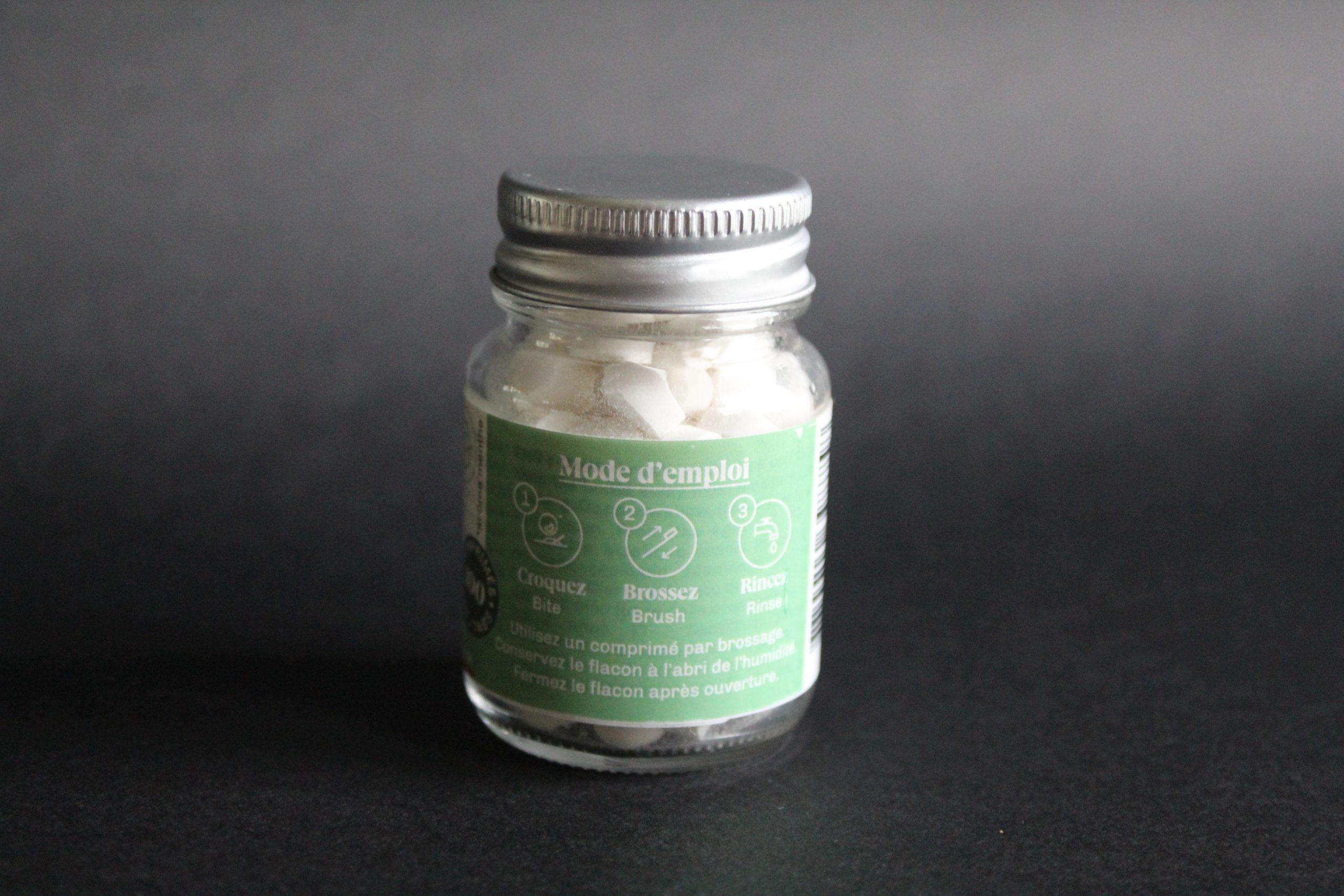 1 comprimé = 1 brossage de dents (Andréa le croque en deux parce qu’un entier c’est “trop” pour elle. À vous de tenter l’une ou l’autre des version)